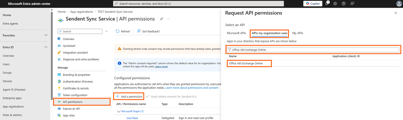 Click Add a permission > APIs my organization uses and search for Office 365 Exchange Online.