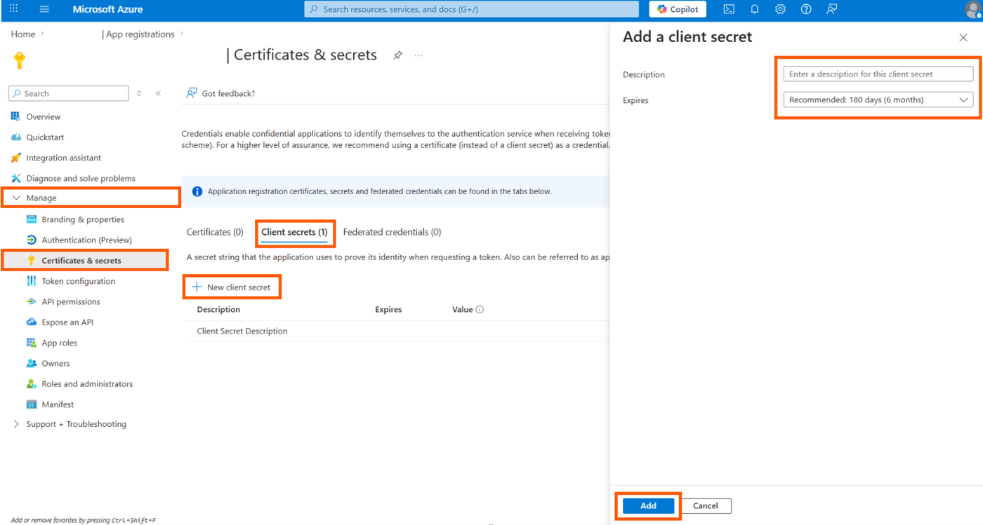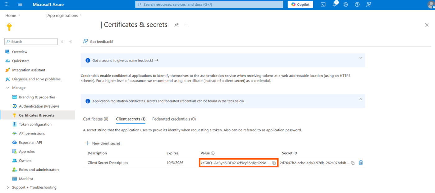 Why this is needed: The Client Secret acts as the password for your newly registered application, proving its identity to Microsoft Entra ID when requesting an access token.