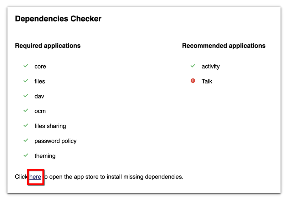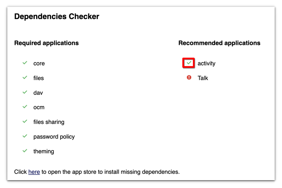 The Dependency Checker feature in Nextcloud allows administrators to ensure that their instance is set up correctly for use in Sendent. This tool scans your system for any missing dependencies that may cause problems with Sendent's functionality. A green checkmark next to the application name indicates that the application is installed and ready to use. Conversely, a red warning sign means that you need to install the application before you can use it.