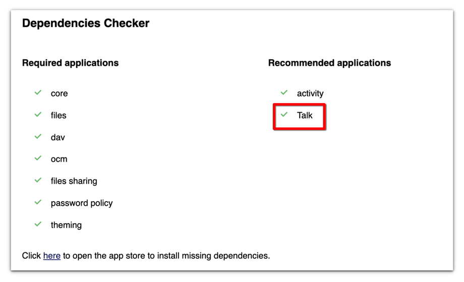 2. Click the here link at the bottom of this section to open the app store and install the missing dependencies.