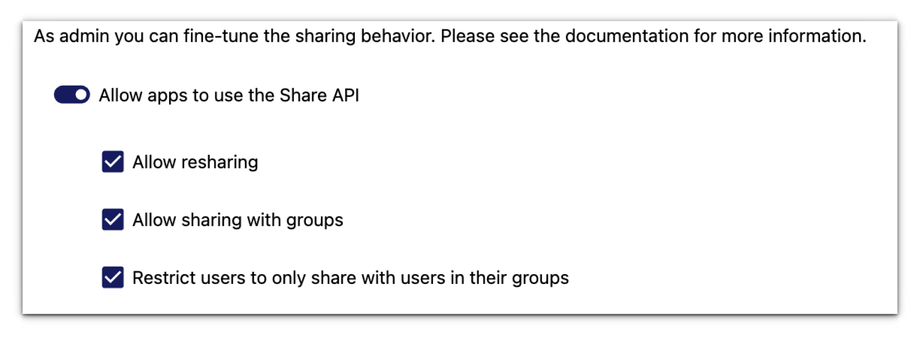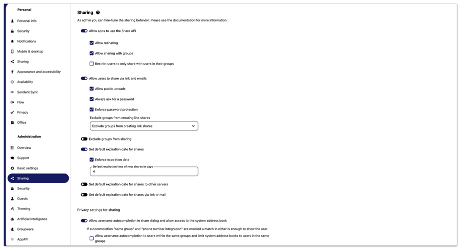 Nextcloud allows administrators to fine-tune the sharing behaviour to align with organizational policies and enhance security. This guide will walk you through the various sharing settings available in Nextcloud.
