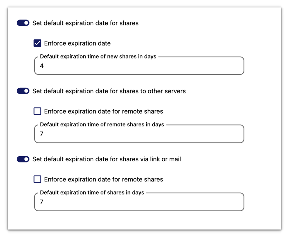 When the expiration date for remote shares is enforced, all shares sent to other servers will automatically expire after the specified number of days, and users cannot change this expiration date.