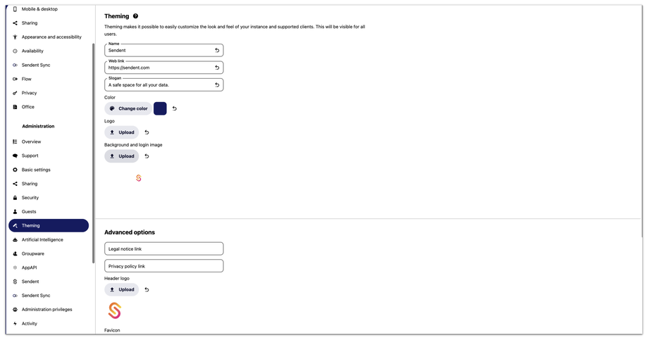 On this page, you can customize the look and feel of your Sendent instance according to your organization's corporate design by replacing the default logo and color with your own assets.