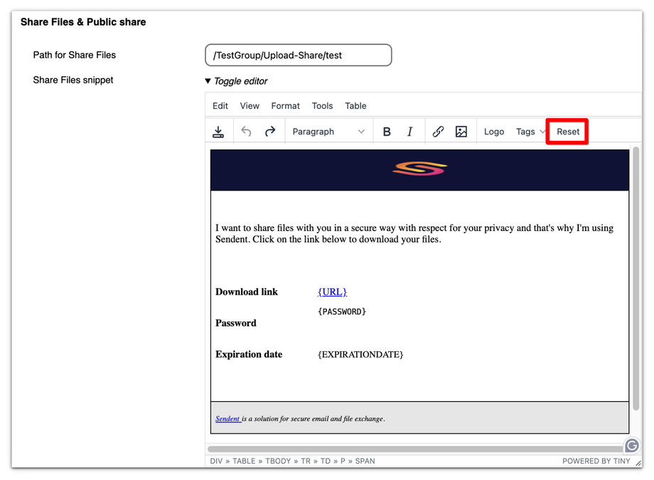 If needed, you can reset the HTML snippet to its default settings by clicking the Reset button in the WYSIWYG editor.