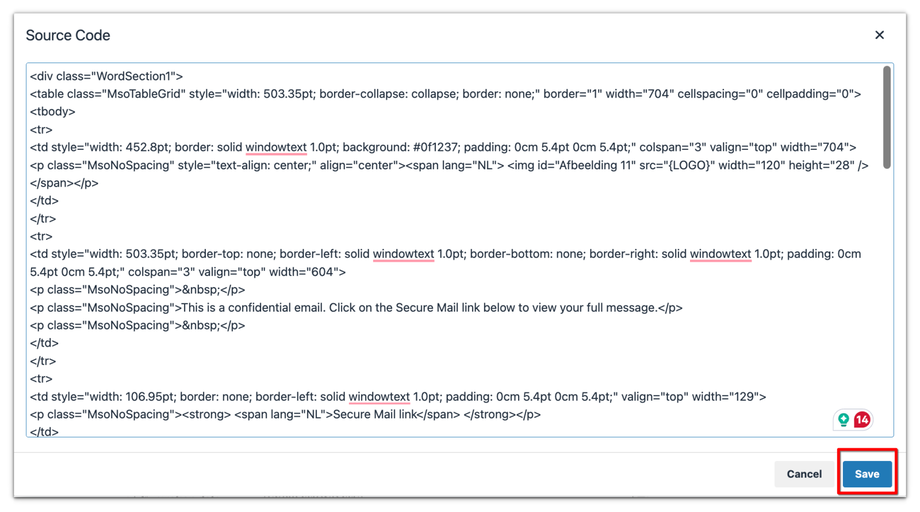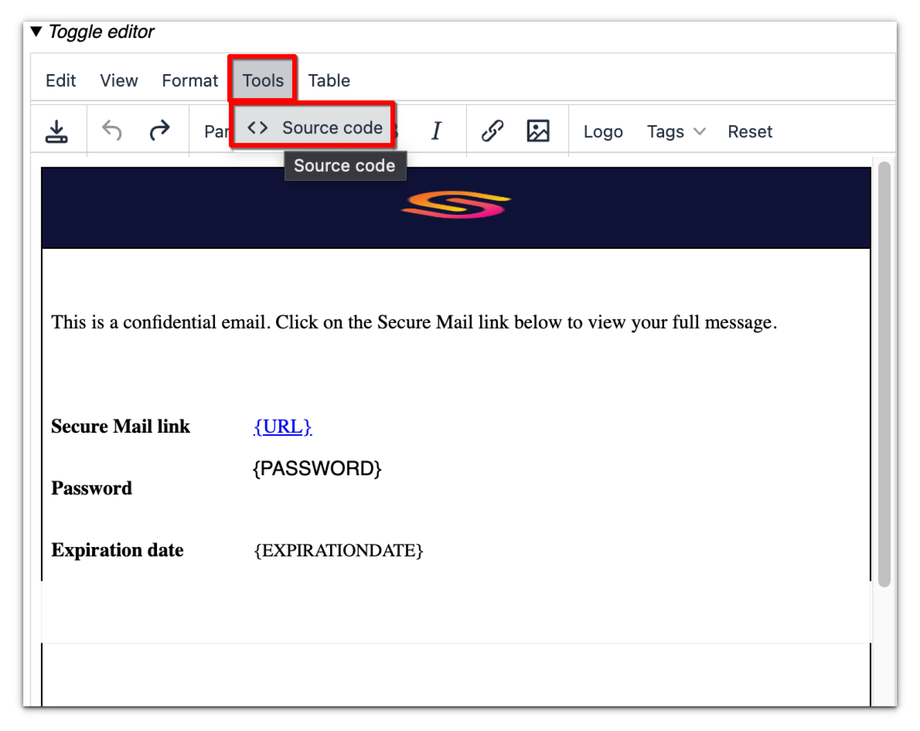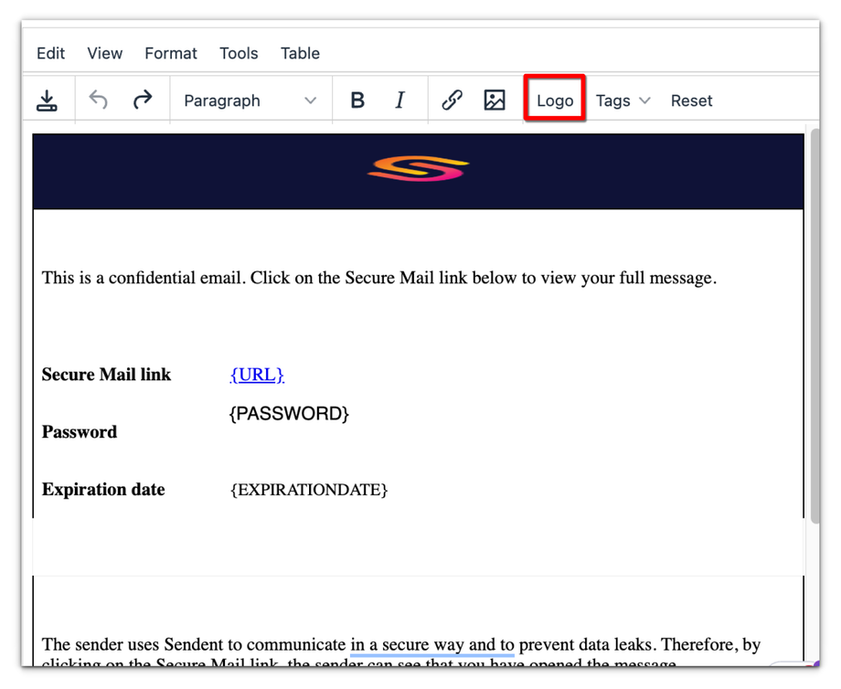 The WYSIWYG editor allows you to place tags at your chosen locations within the HTML snippet. The Outlook add-in will later replace these tags with the relevant data.