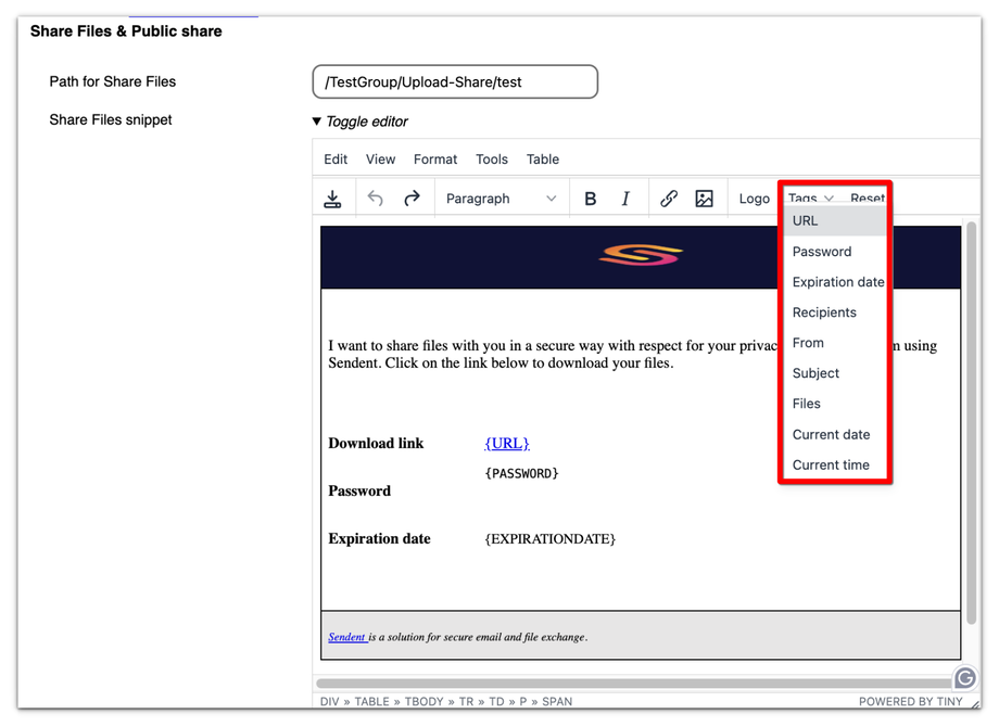 {FILES} or {3} - List files (uses <ul><li> tags){RECIPIENTS} - List recipients{FROM} - List from sender (e.g. info@sendent.nl){SUBJECT} - Subject name{CURRENTDATE} - Current date{CURRENTTIME} - Current time{LOGO} - Display set Nextcloud logo from theming