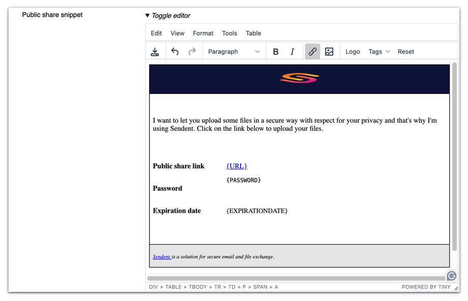 Starting from version 1.3 of the Sendent app for Nextcloud, you can edit HTML snippets using a new WYSIWYG editor available in the settings page. This editor allows you to use common formatting tools to change the snippets inserted into email bodies.