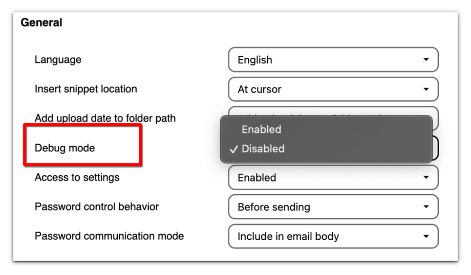 Enabling the debug mode generates a log file that can be very useful when contacting Sendent support. To create this log file, enable debug mode, open Outlook, and perform the specific action causing the issue or bug. Then, complete a similar action that works without any issues (e.g., open Public Share and upload a file).