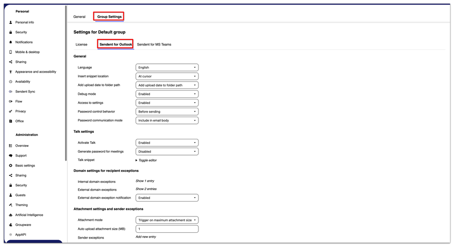 4. Navigate to the group settings section and switch to Sendent for Outlook option.