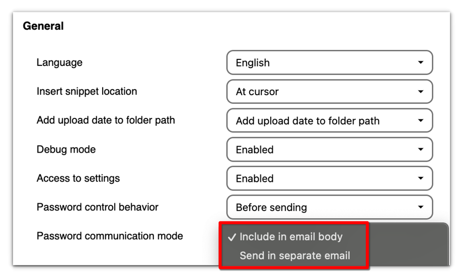 If the password communication mode is set to "send in separate email," the default snippet for Share files and Public share will still include the password unless specifically adjusted to exclude it.