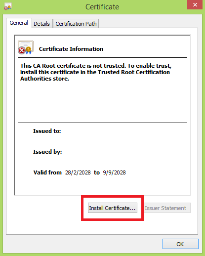 2. The following dialog should prompt, it gives you the ability to inspect the certificate and also to install it. Notice, that the certificate is not trusted.