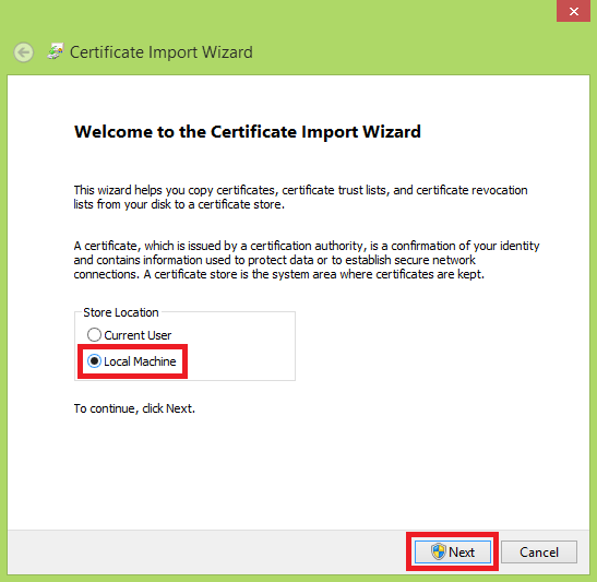 4. We will be installing the certificate on machine level. Set it to store location 'Local Machine'. Click 'Next', you will be prompted for Administrator permissions.