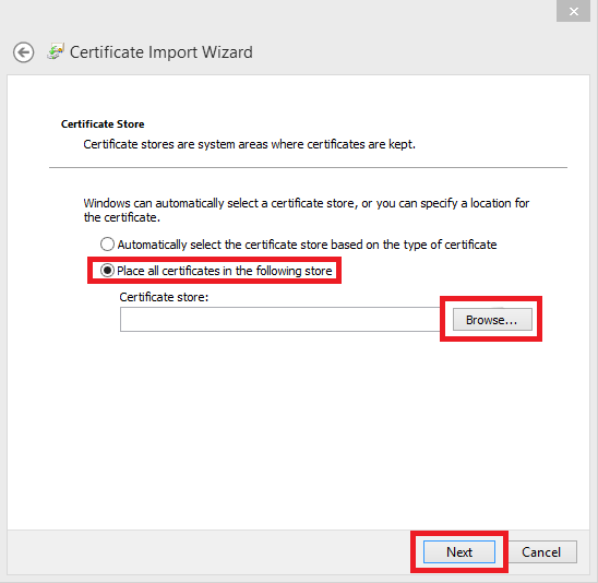 5. Choose the option 'Place all certificates in the following store' and click 'browse'.