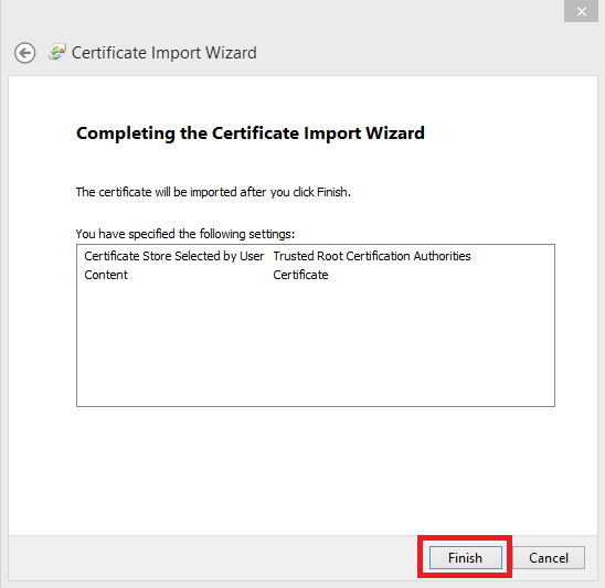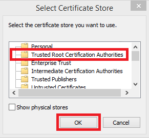 6. A new (small) window will pop up, select 'Trusted Root Certification Authorities' and click 'OK'. Your dialog will go back to the previous step and click 'Next'.