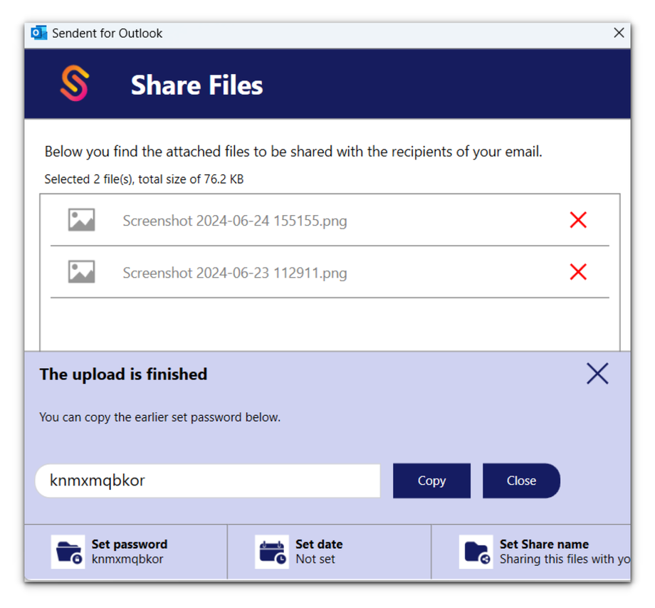 Once the upload of files is finished, users will also be prompted to confirm the password once again and close the dialog or copy the password.