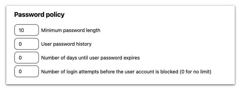3. On the security page, navigate to the password policy section. In this section, you can do the actions below to enhance security:
