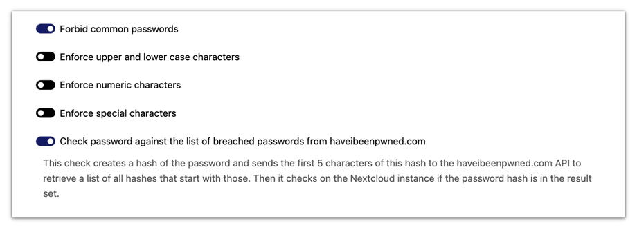 Toggle the switch labeled Check password against the list of breached passwords from haveibeenpwned.com to enable this feature. When enabled, this check creates a hash of the password and sends the first 5 characters of this hash to the Haveibeenpwned.com API to retrieve a list of all hashes that start with those characters.