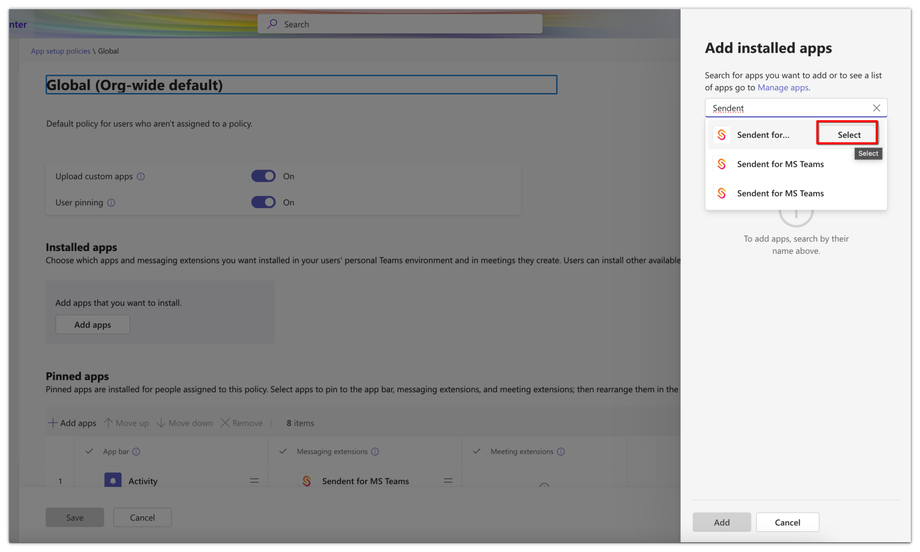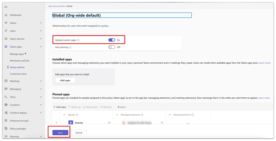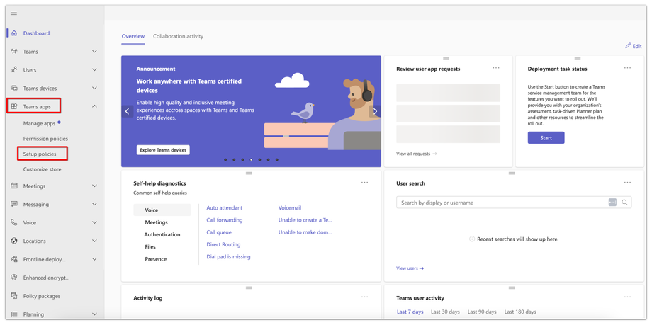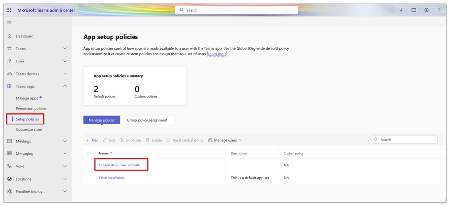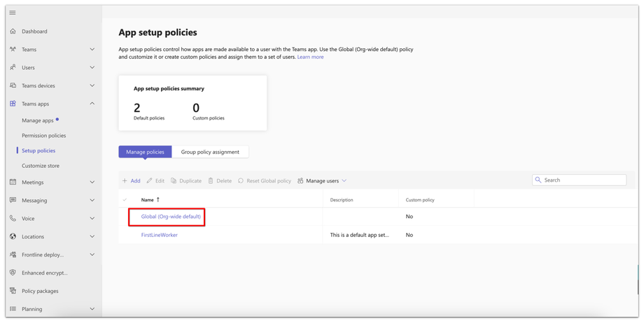 On the Setup Policies page, you can control how apps are made available to a user with the Teams app. You can customize the Global (Organization-Wide default) policy or create custom policies and assign them to a set of users.