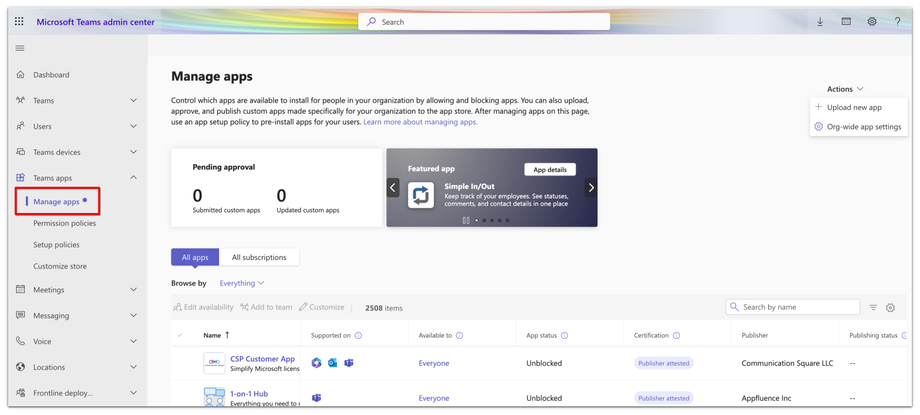 7. From the left-hand panel, under the ‘Teams apps’ section, click the ‘Manage apps’ option.