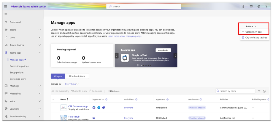 8. On the manage apps section, click the Actions button and click the Upload new app option.