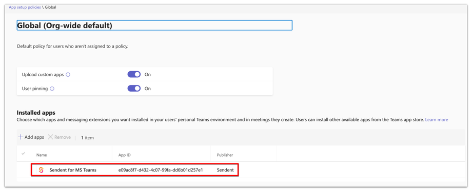 11. Once the Sendent Teams App is uploaded, click on ‘Setup Policies’ from the sidebar menu and click on ‘Global (Org-wide default)’.