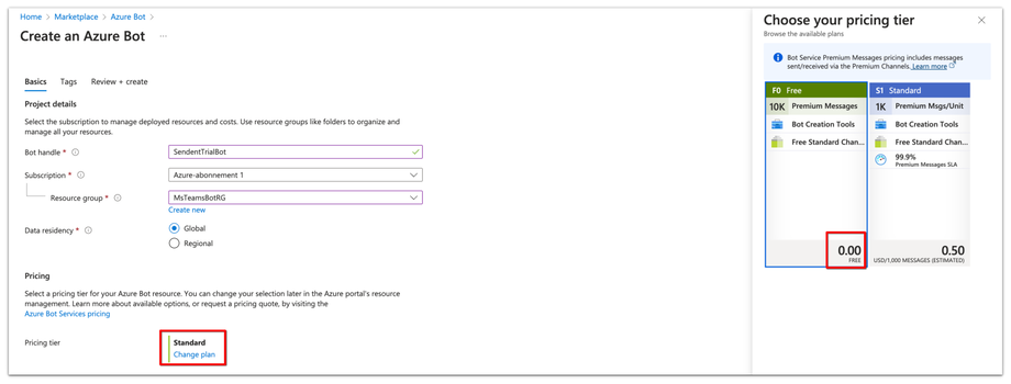 8. Select a pricing tier for your Azure Bot resource. You can change your selection later in the Azure portal's resource management.