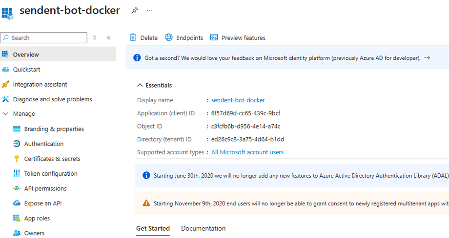 Next, in your overview of 'App Registrations', open the just registered Azure Bot framework app-registration.