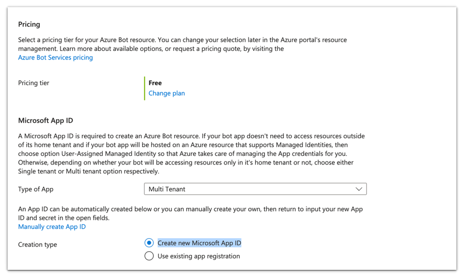 11. A Microsoft App ID is required to create an Azure Bot resource. Choose the option to create a new Microsoft App ID.