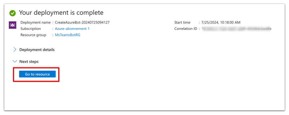 14. Once you've finished setting up the resource, you can proceed from the deployment overview to the actual Azure Bot resource itself.