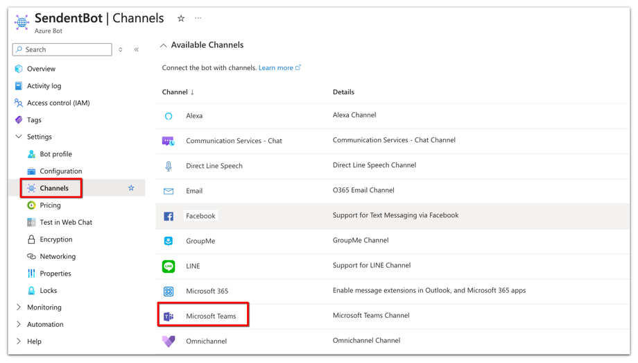 In the Azure Bot resource, navigate to Settings > Configuration.