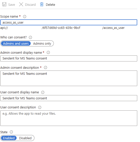 api://msteams.example.com/6f57d69d-cc65-439c-9bcf/access_as_user, if the example DNS name was set.The scope name should be access_as_user.