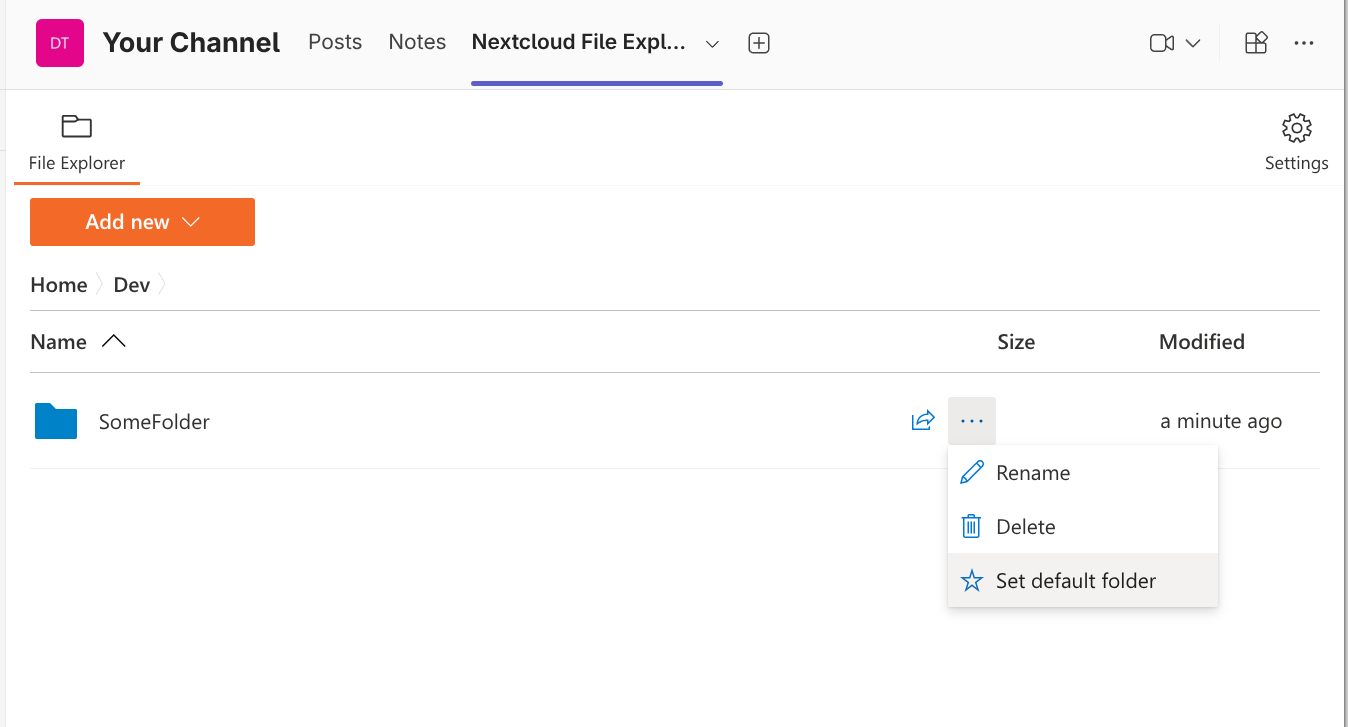As a team or channel owner, you can set a default Nextcloud folder for file uploads within Sendent for Microsoft Teams. This ensures any files shared within a specific team or channel are automatically uploaded to a designated directory on Nextcloud, keeping your files organized without requiring users to manually select a destination each time.