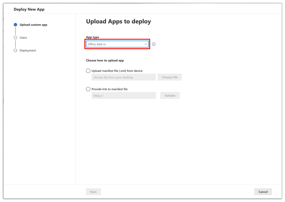 4. Select the app type from the pop-up window and choose "Office Add-in" as the app type.