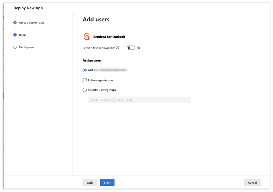 When installing the add-in, you have the flexibility to choose between two distribution methods: at the individual level or the organizational level. To learn how to distribute the Sendent for Outlook at an organizational level, please refer to the use guide here.