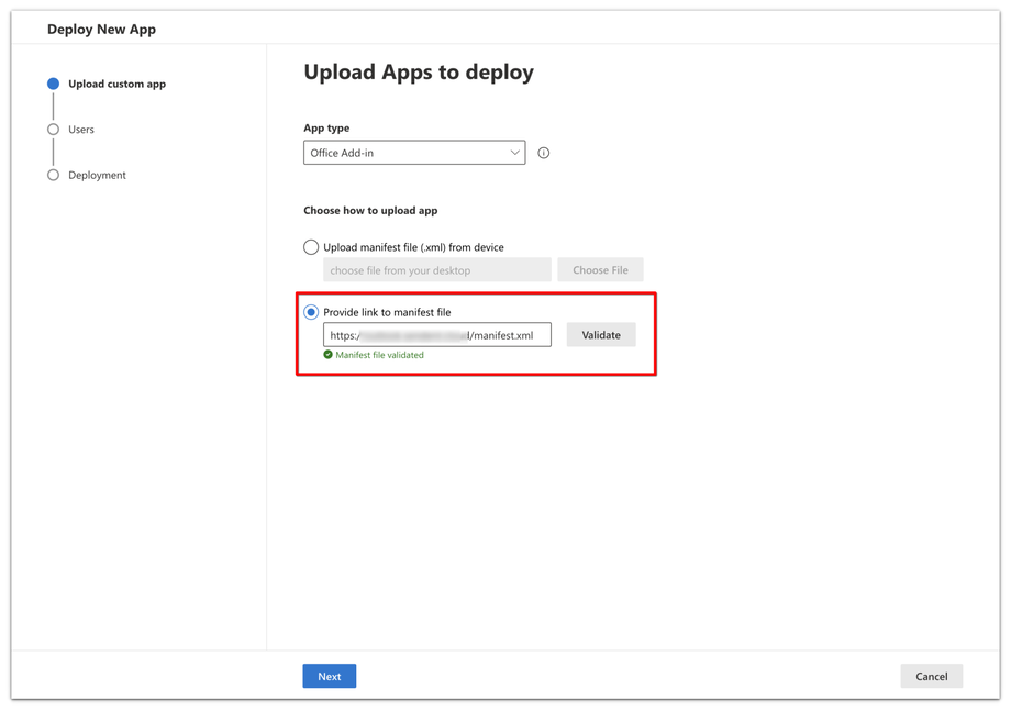 5. Enter the manifest file URL: https://<yourdomain>/manifest.xml.