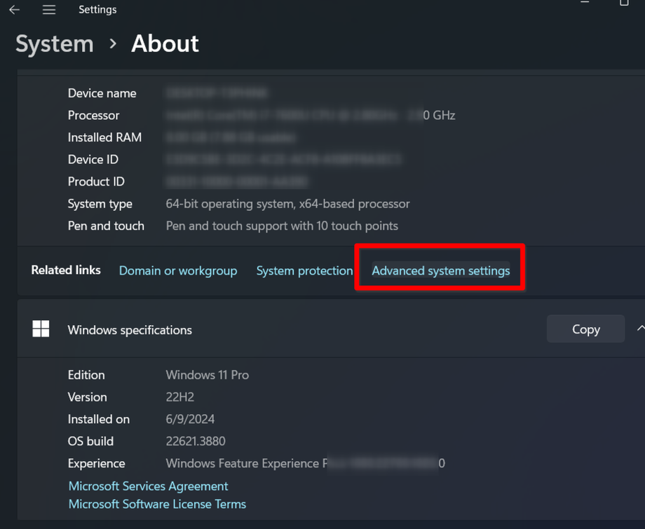 3. Go to Advanced system settings.