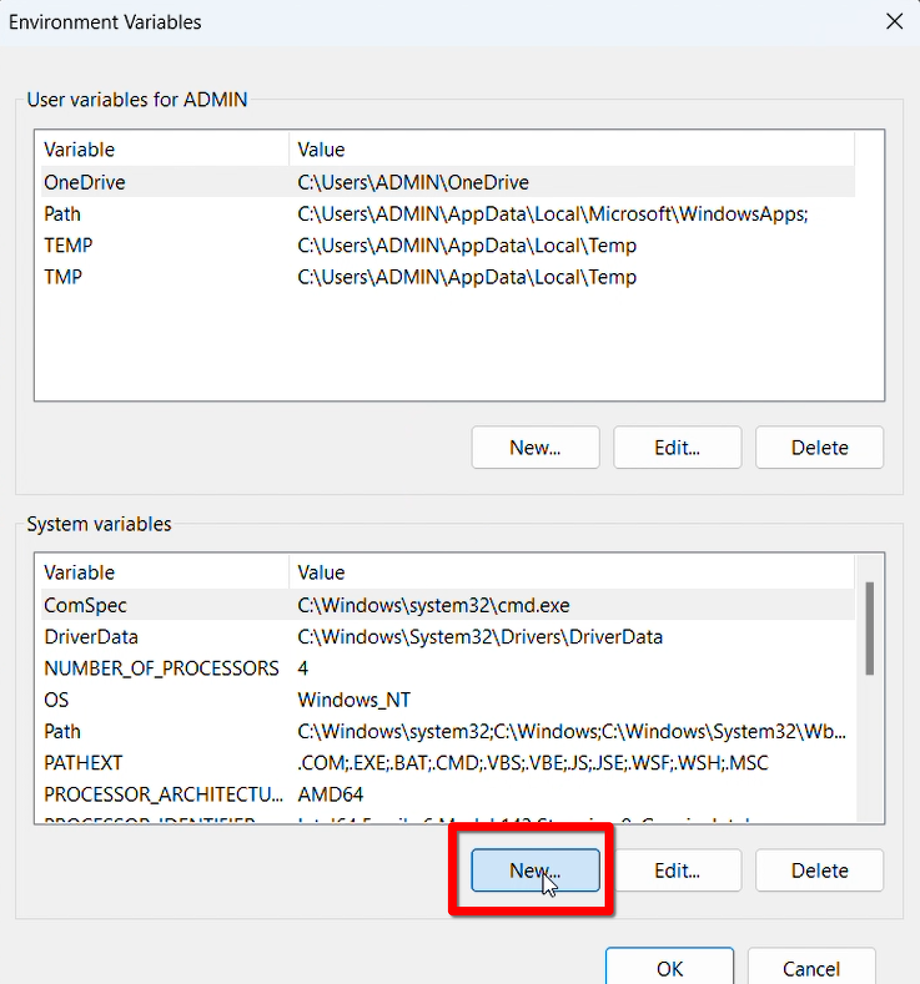 4. Under System variables, click New.