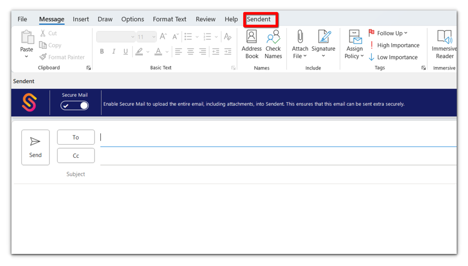 1. Click on the "Sendent" tab in the email dialog ribbon to open the Sendent settings menu.