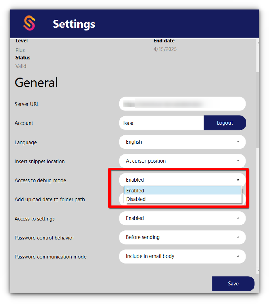 3. In the Sendent settings menu, look for the option to enable access to debugging mode.