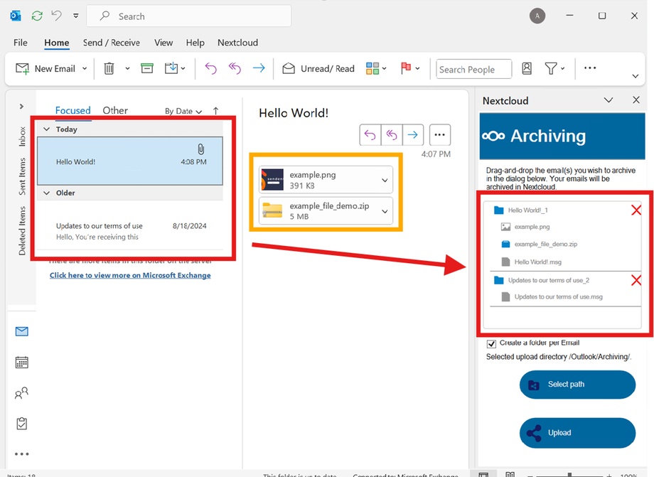 - Upload the attachments + original email and secure mail (for convenient rendering in Nextcloud).