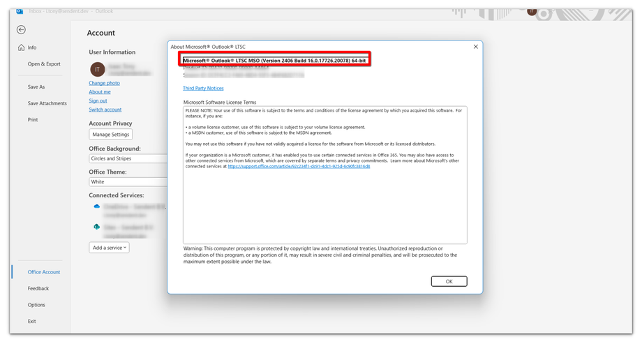 6. At the top of this about page, you'll find information about the build and if your Outlook version is a 64 or 32-bit.