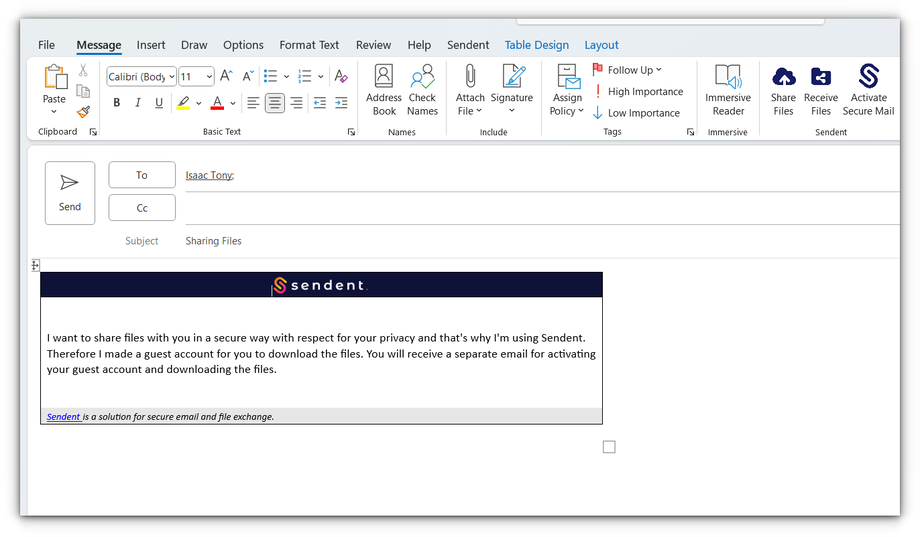 An email template will be inserted containing the download link and, if applicable, the password and expiration date.