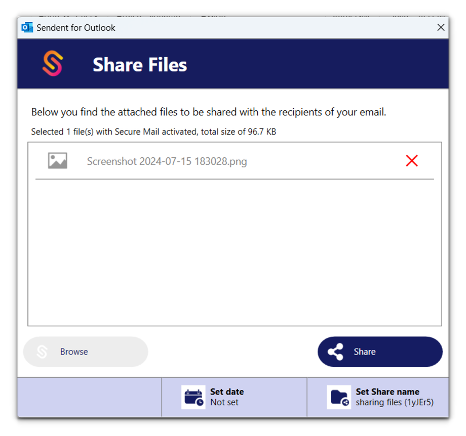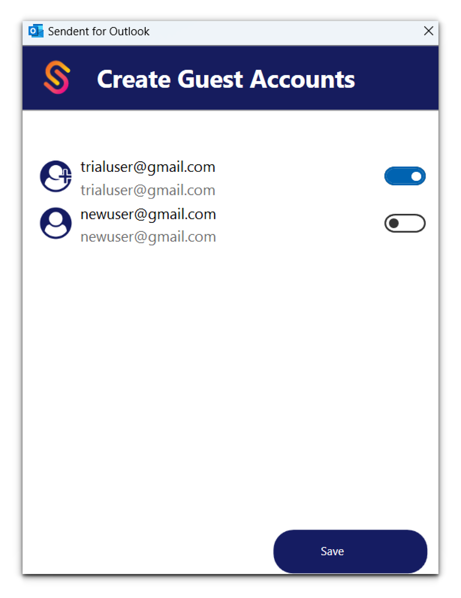 When the guest feature is enabled, a window will appear when you click on “Share” in the Sendent window. You can select one or multiple email addresses. If you're an Admin, please refer to this guide on configuring the guest account settings.