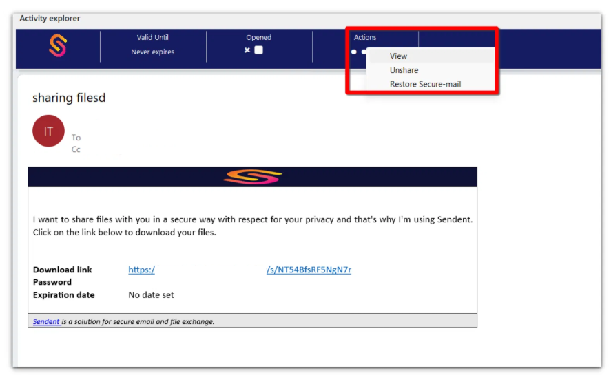 7. Click on the Actions button. Here, you can view, unshare, or restore secure email.