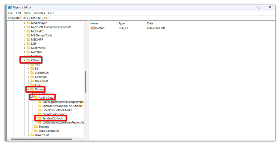5. Under the Outlook section, click on AddinsData and click on SendentOutlook