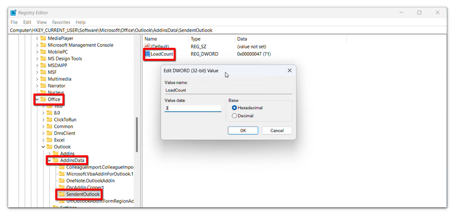 Some clients may experience an issue where the Sendent for Outlook plugin keeps disabling on start-up. This can be due to performance issues during Outlook start-up or a previous crash of Outlook. This guide provides steps to diagnose and resolve this behavior by modifying a registry entry.