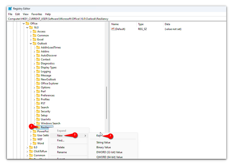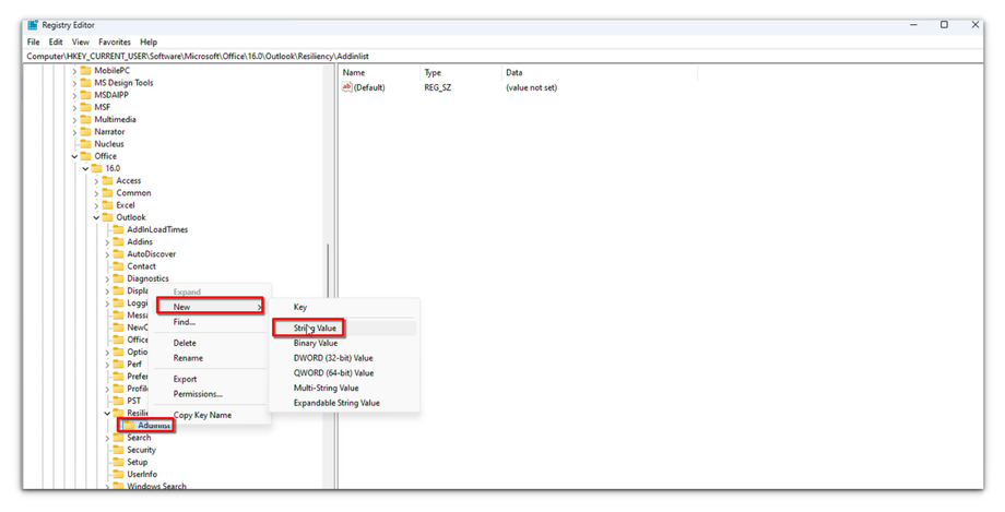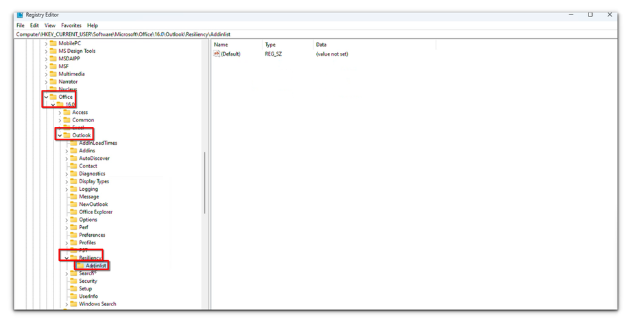 HKEY_CURRENT_USER\Software\Policies\Microsoft\Office\16.0\Outlook\Resiliency\AddinList