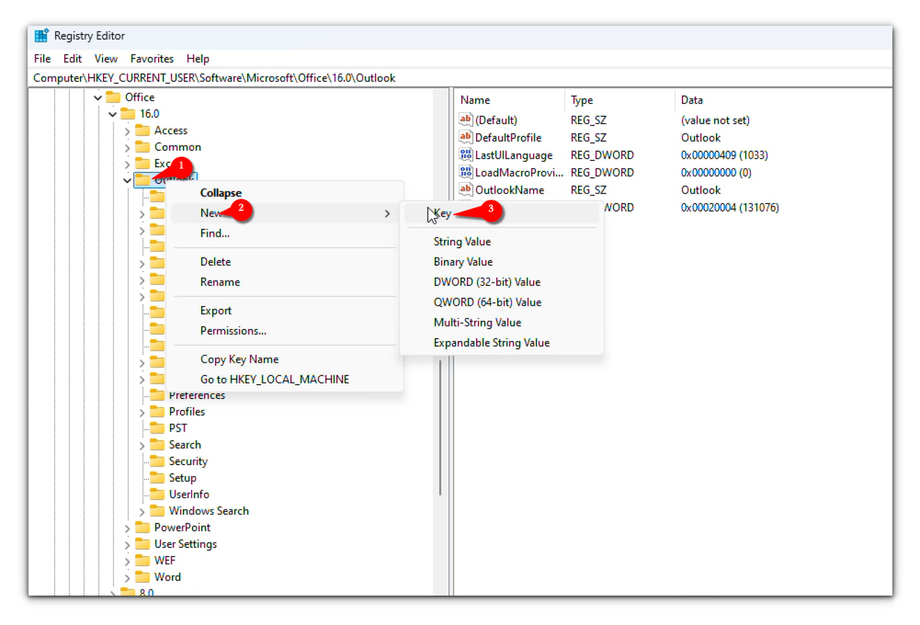 2. Under the Microsoft section click the Office tab and then navigate as shown in the steps in the image below. Office > 16.0 > Outlook > Resiliency > Addinlist